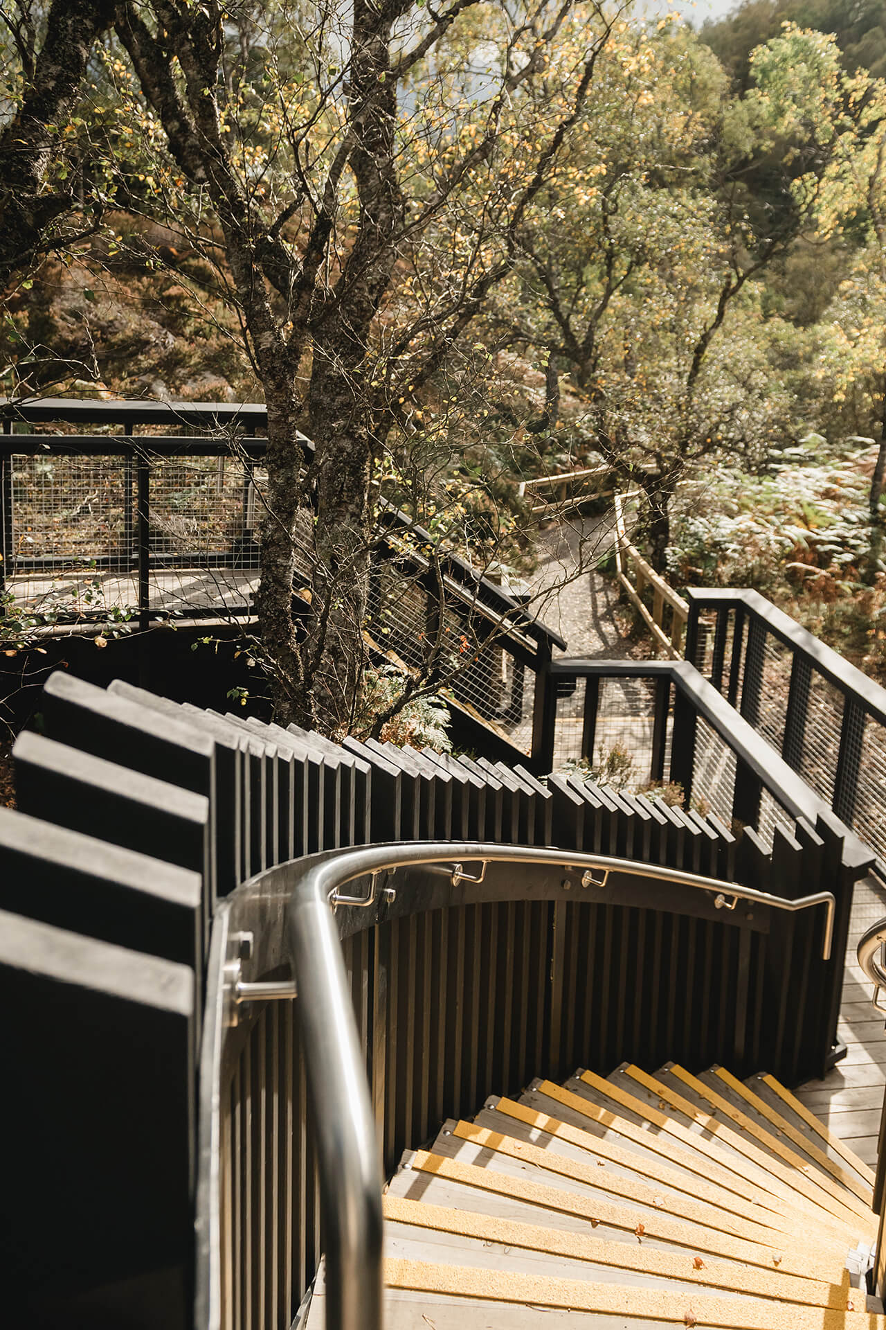 Le corps principal de la tour se niche dans un creux bas, permettant aux utilisateurs de remonter à travers la structure pour accéder aux zones plus hautes et plus exposées du site. C’est une récompense à la fois visuelle et expérientielle pour ceux qui se sont aventurés sur le chemin victorien réaménagé, offrant non seulement une vue imprenable sur le Loch Katrine et les Trossachs, mais aussi un lieu magique pour une contemplation tranquille.