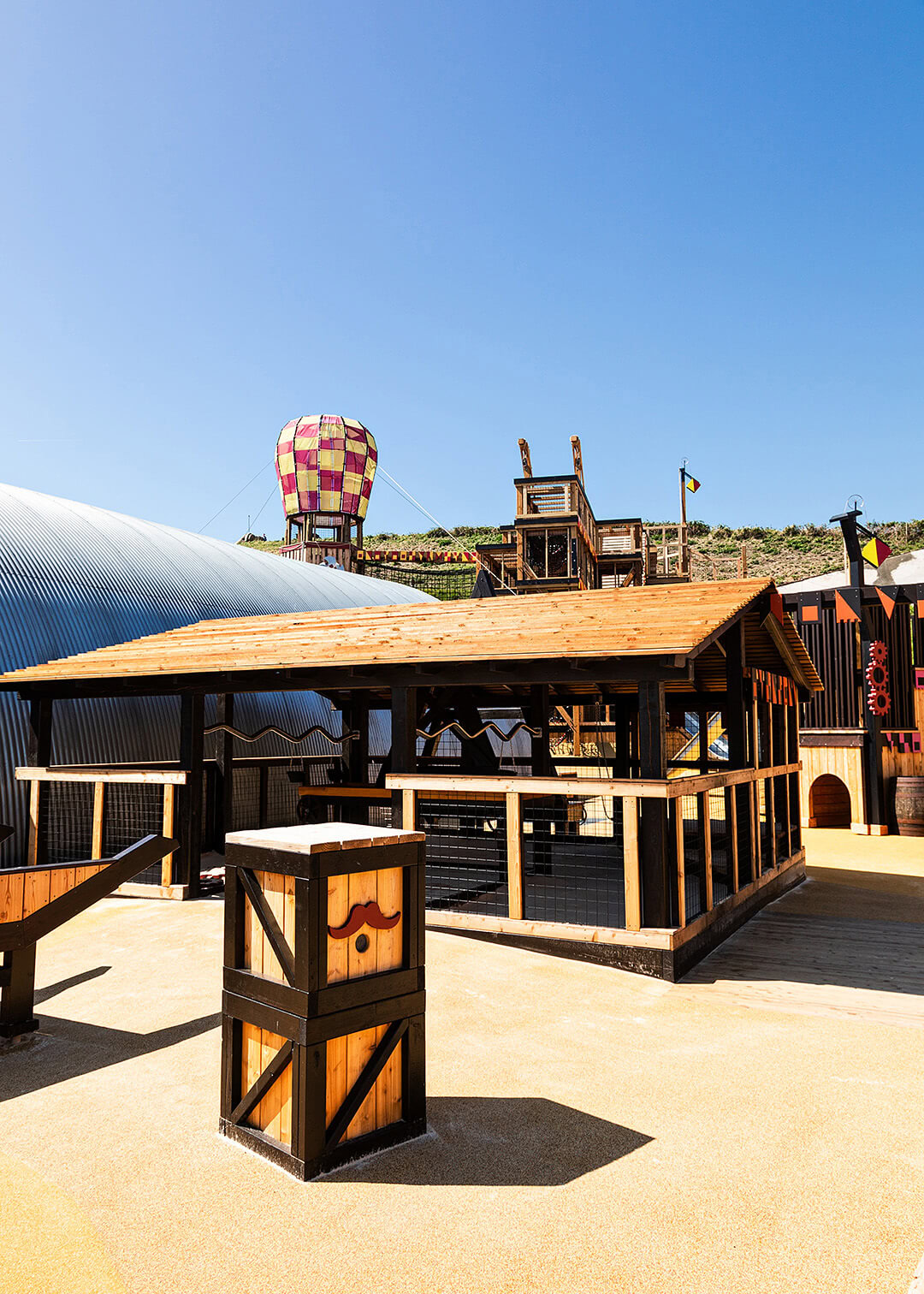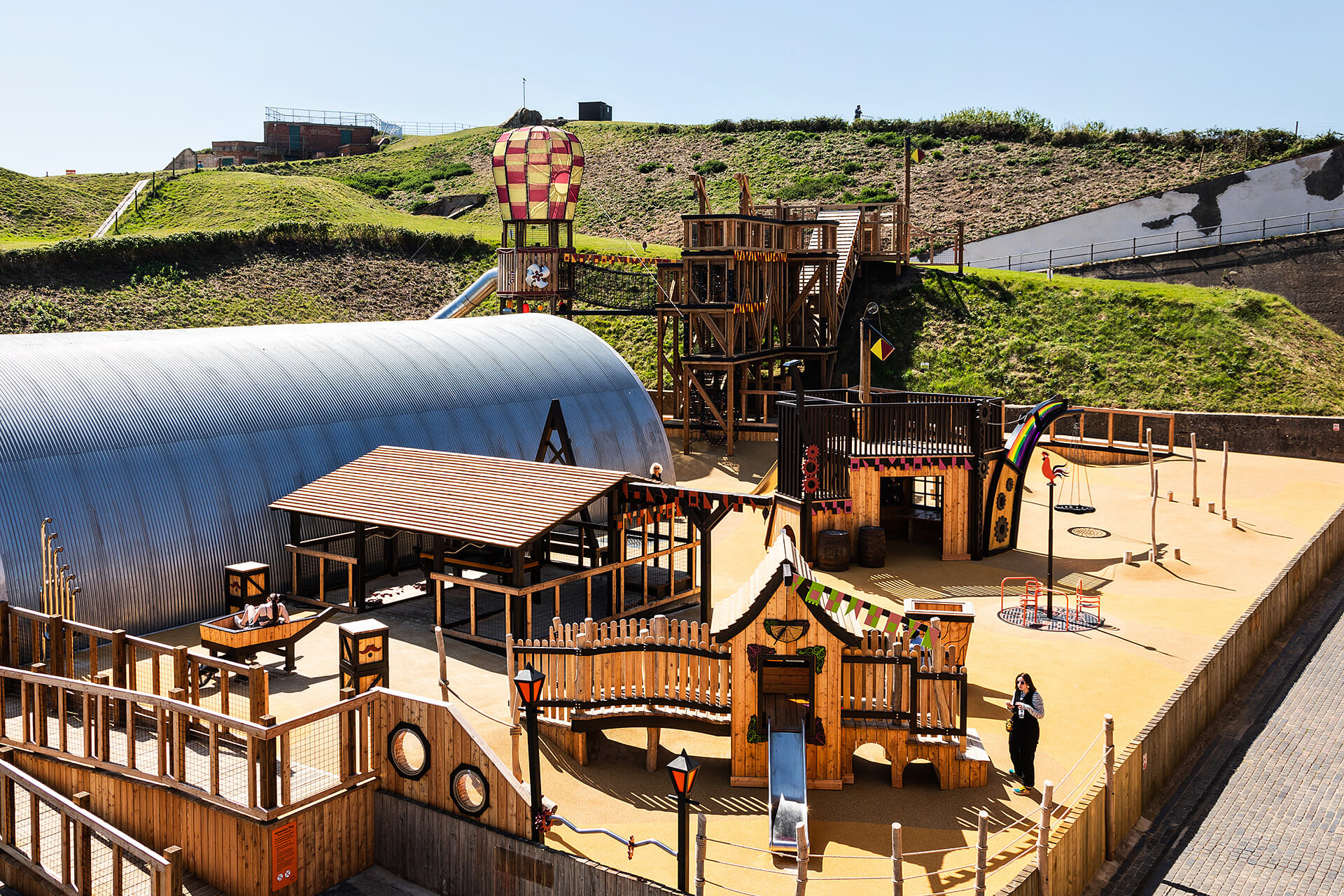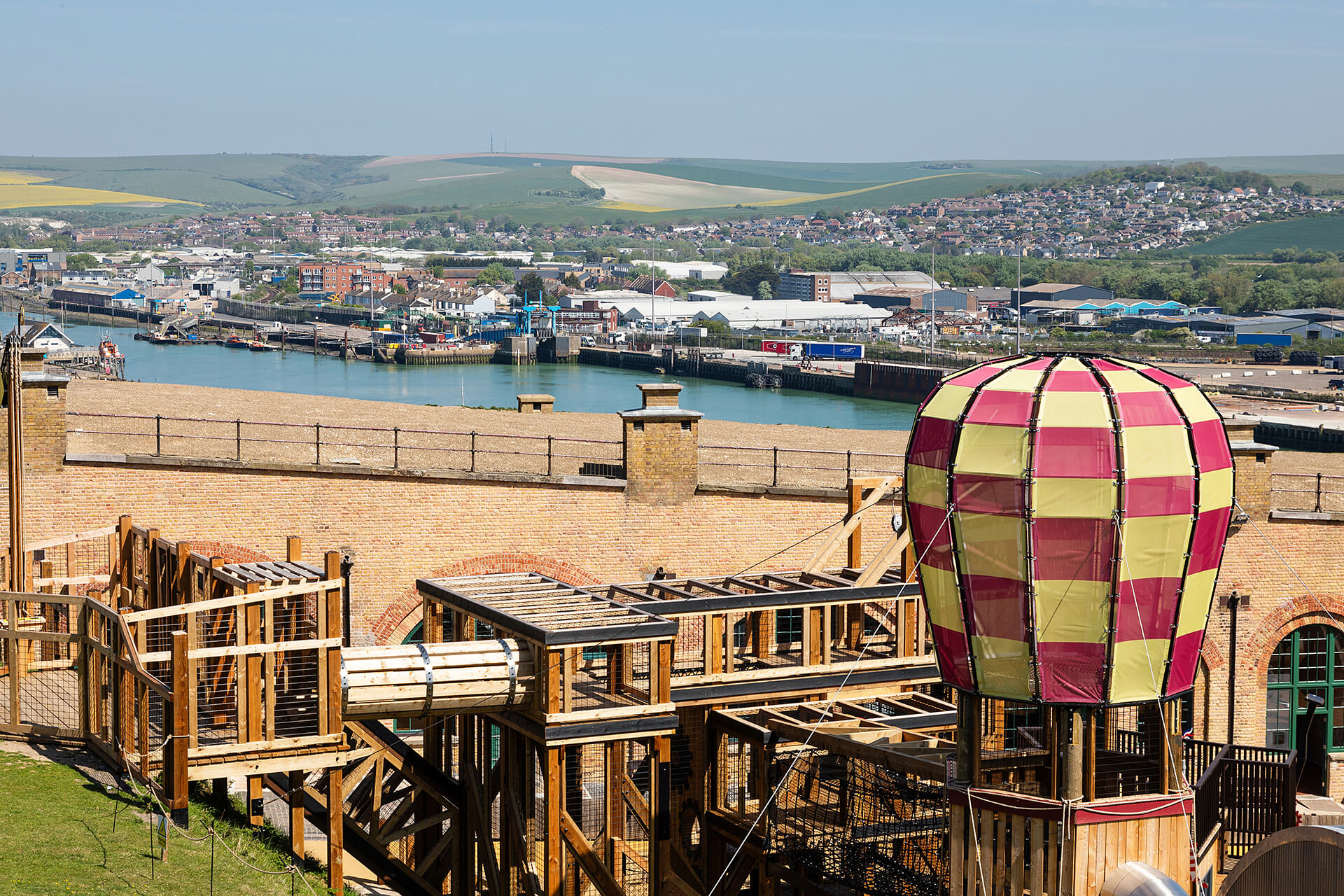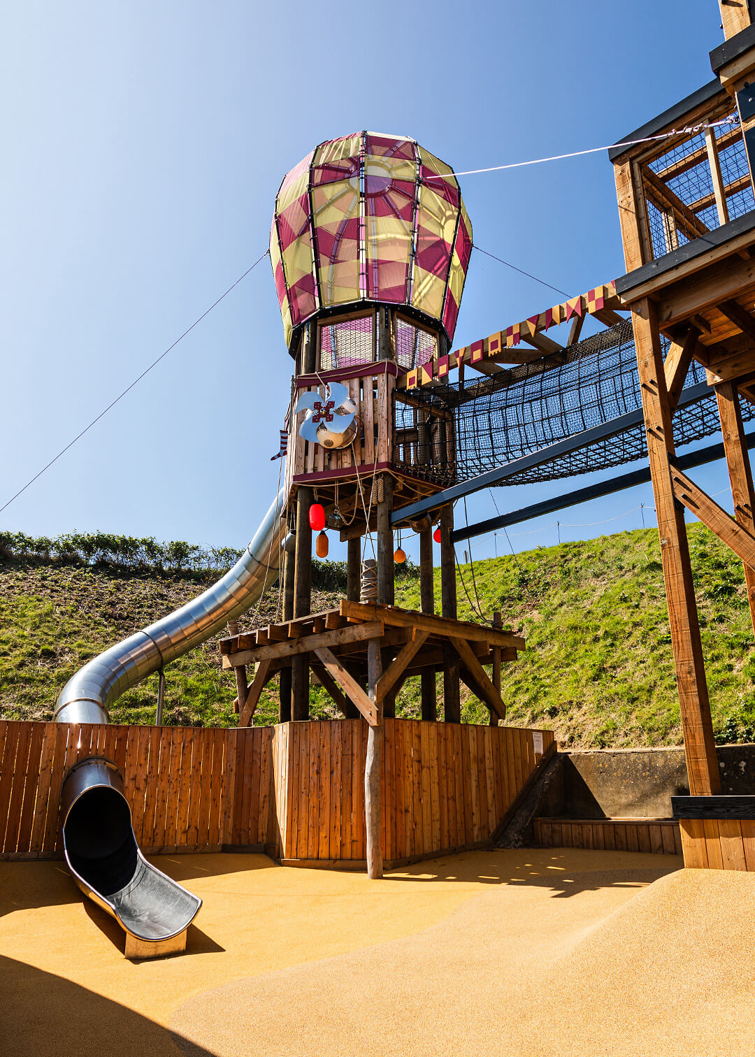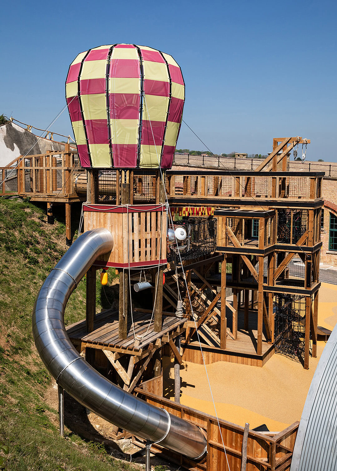 The dirigibles were very much a feature of the period and, in their day, were used to extend the view out to sea, as part of the fort's innovative defences. We used the height of our recreated dirigible to create views across the bay and a launch platform for the 5m high slide. the steam punk aesthetic was added as an extra layer to fire the guest's imagination. Access is via the high climbing rope bridge, which creates a genuine challenge for many.