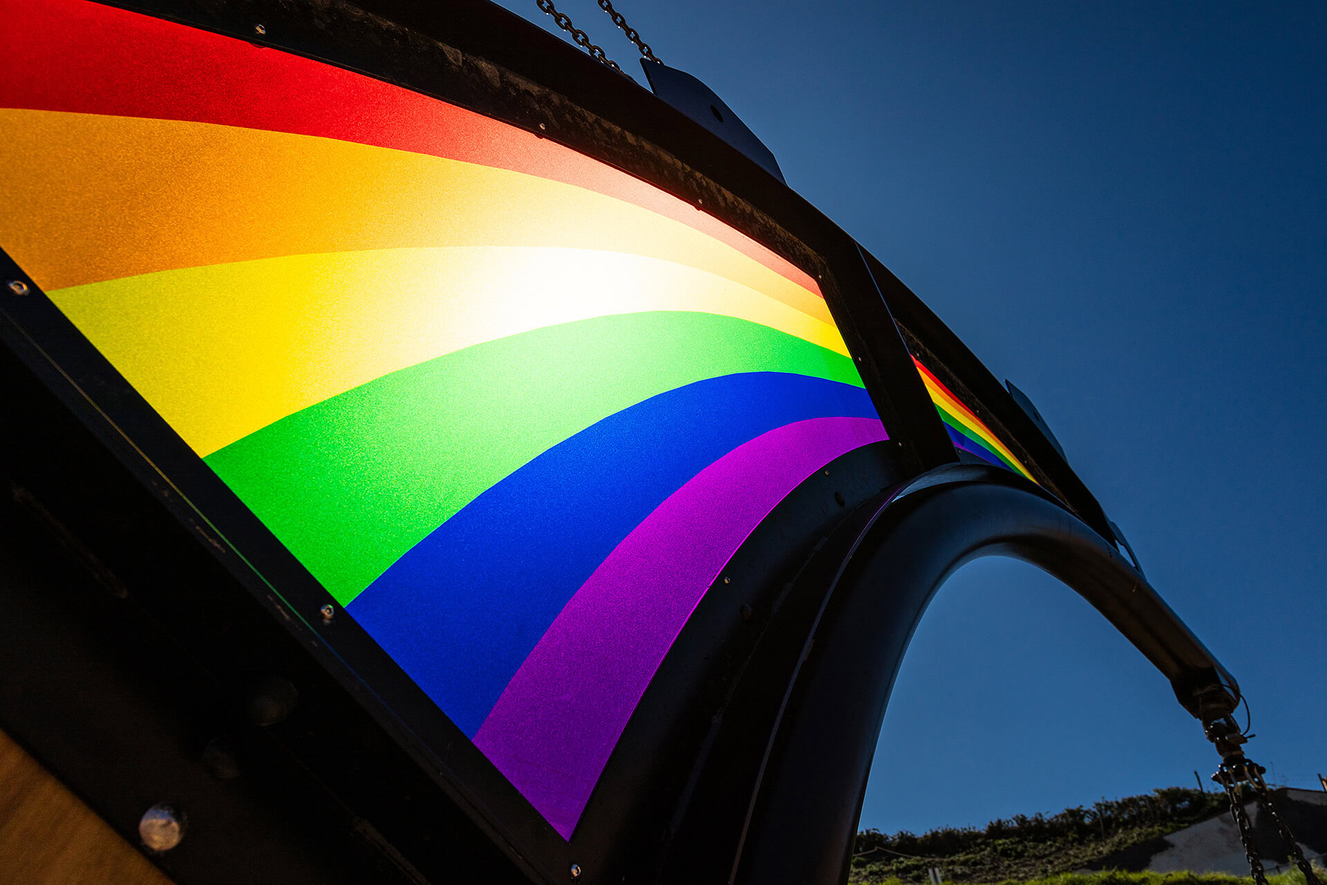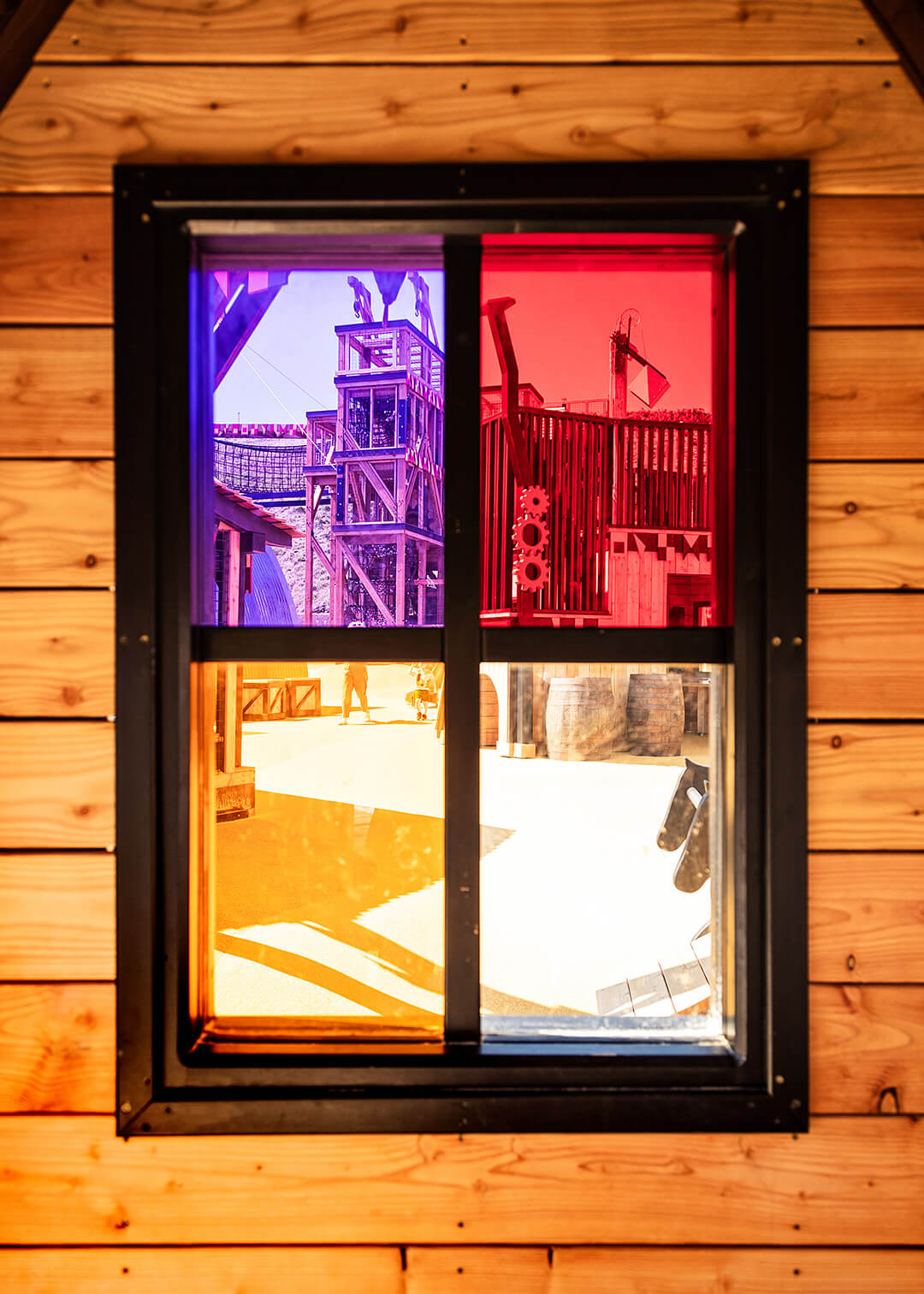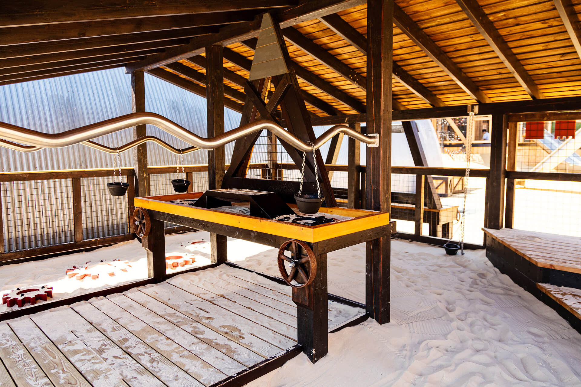 A multi-person basket swing hangs from steam crane embossed with a rainbow that catches the light. This feeds into the concept of the fort being a construction site in the Victorian period.