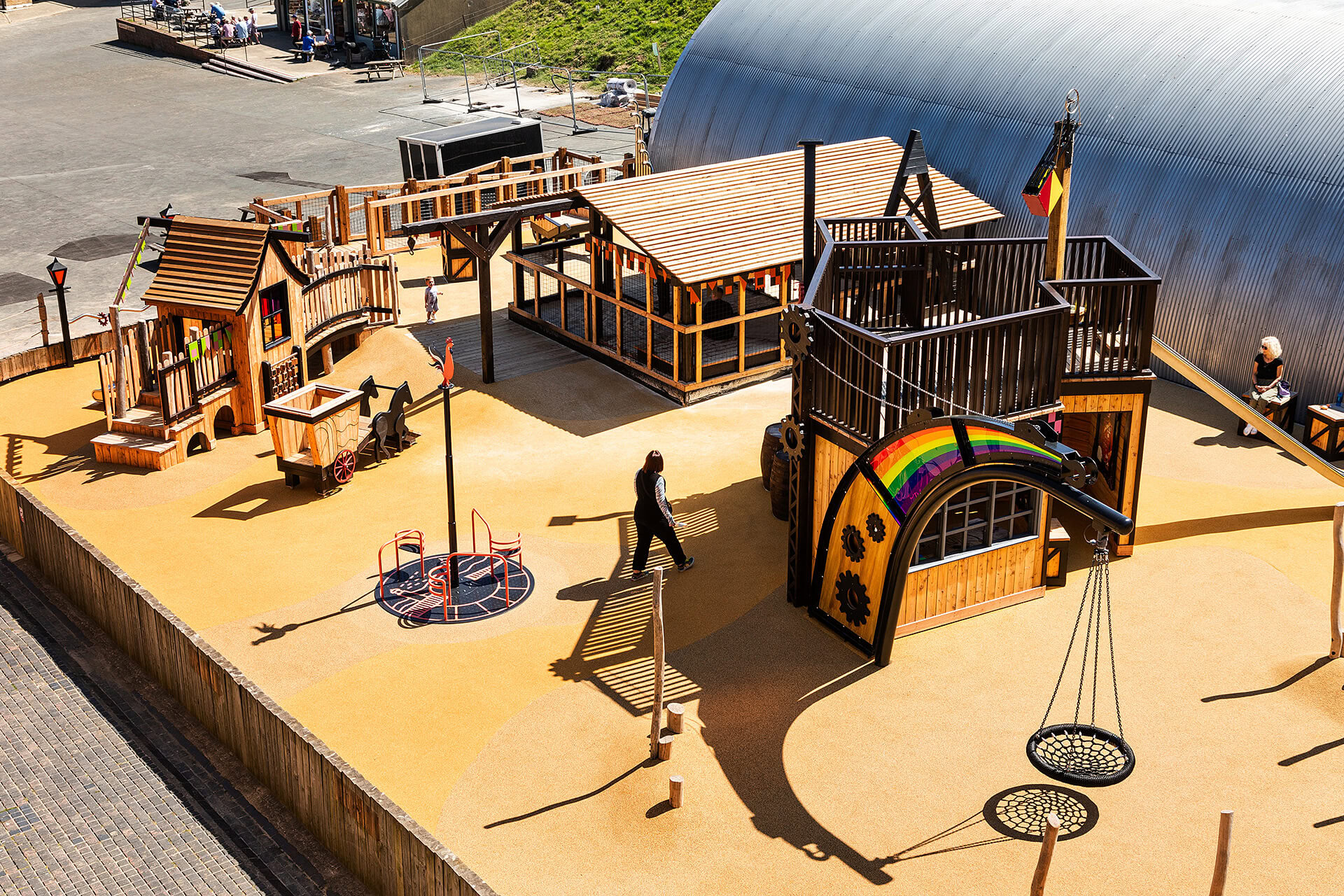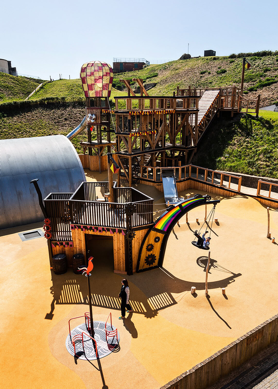 The finished playground features an array of attractions, including a whimsical dirigible floating above the play space, a shingle hoist climbing frame, a huge steel slide, toms of ground and toddler play and a cradle swing.