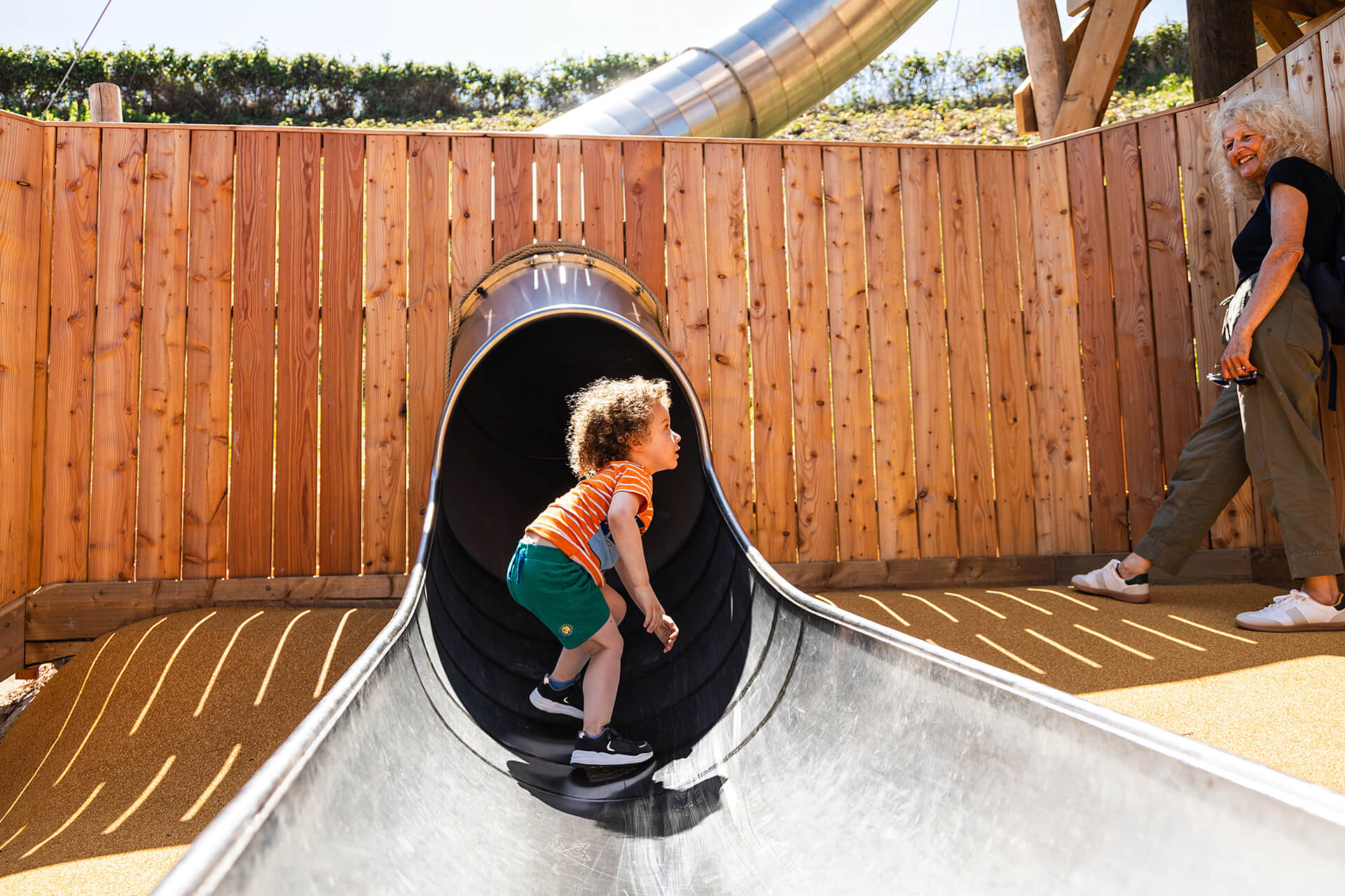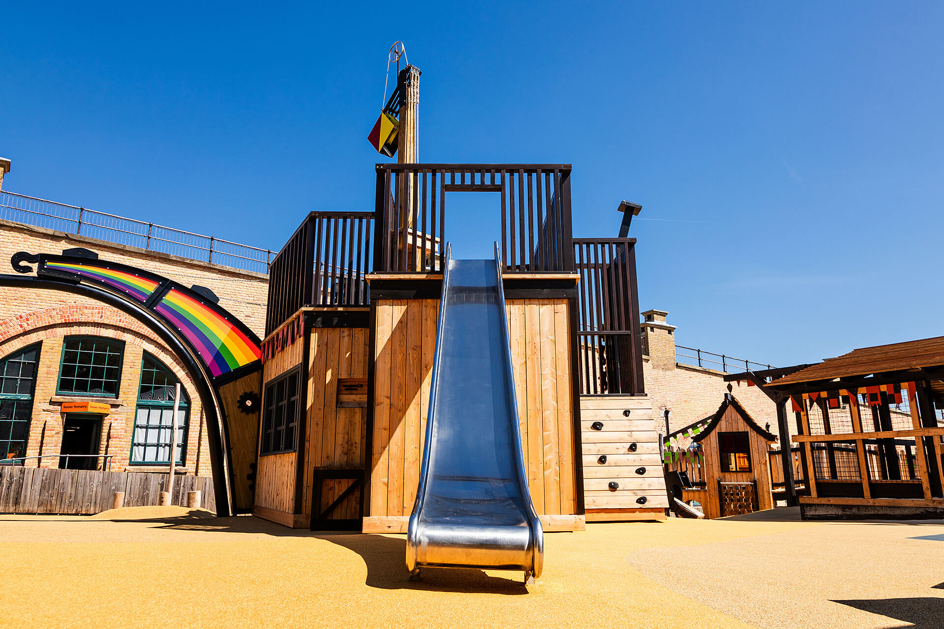 A continuous, impact-absorbing bound rubber safety surface ensures seamless wheelchair access across the site. At the heart of the play area is a bespoke Victorian Steam Crane structure featuring a wide diameter basket swing supporting children with physical disabilities, sensory processing challenges, and additional support needs. Inside, an interactive activity panel includes tactile elements, speaking tubes and braille to promote multi-sensory engagement and inclusive storytelling. Loose parts & sound play interactions along with a covered sand play area all feature here and are designed with universal access in mind. The high-level Shingle Lift play structure features a wheelchair-accessible ramp leading to a companion slide with a transfer-friendly platform and raised exit for dignified, independent, or assisted use. Accessibility was not treated as an add-on in the design process—it is embedded into every aspect of this play environment, championing equity, participation, and dignity in play.