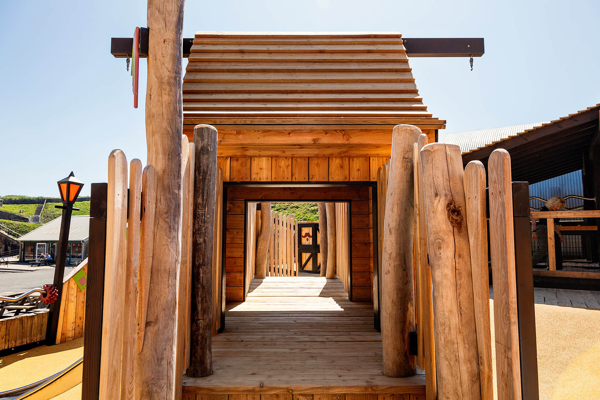 You can see from this image the level of invention that Ardagh delivered on the build of the updated fort. The shingle lift was an Adargh invention and for us, just had to be featured. This was achieved with a chunky timber frame construction, black powder-coated mesh cladding with steel plate details and a pulley and tackle system as theming items.